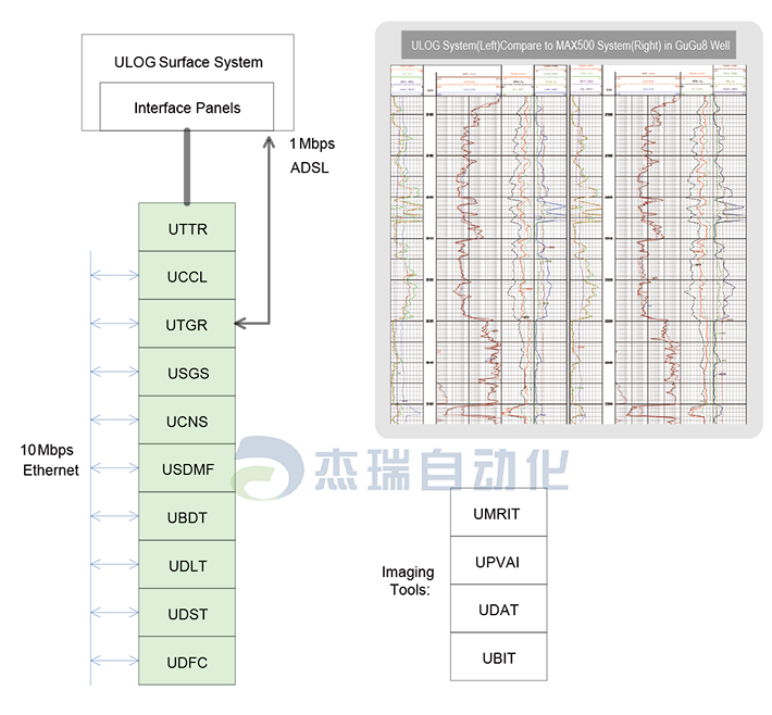 A full range of ULOG tools include conventional logging tools (acoustic, electric, and radioactive logging tools) and imaging instruments (electrical imaging, array induction, array lateral, and dipole acoustic imaging instruments). An instrument has an outer diameter of 89mm and is designed to work under the temperature of 175 and the pressure of 140Mpa.