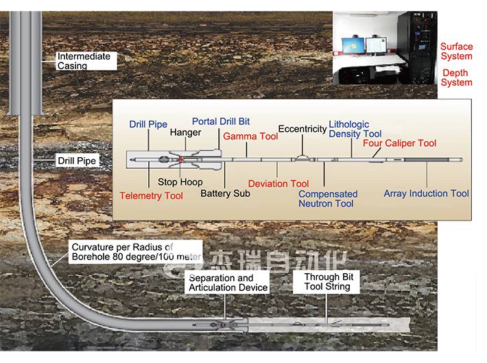 JARI Through Bit Logging System, combined with high-speed cable communication, the downhole wireless communication, repeatedly hanging detachment and slim logging tool storage technology, solves logging problems of the horizontal wells and high angle wells with significant advantages of safety and timeliness, compared to the conventional drill pipe conveying, wet joint of connection and other horizontal well logging. The system has been applied in Daqing and Xinjiang oil fields and goes through the identification of the national Ministry of Science and Technology.