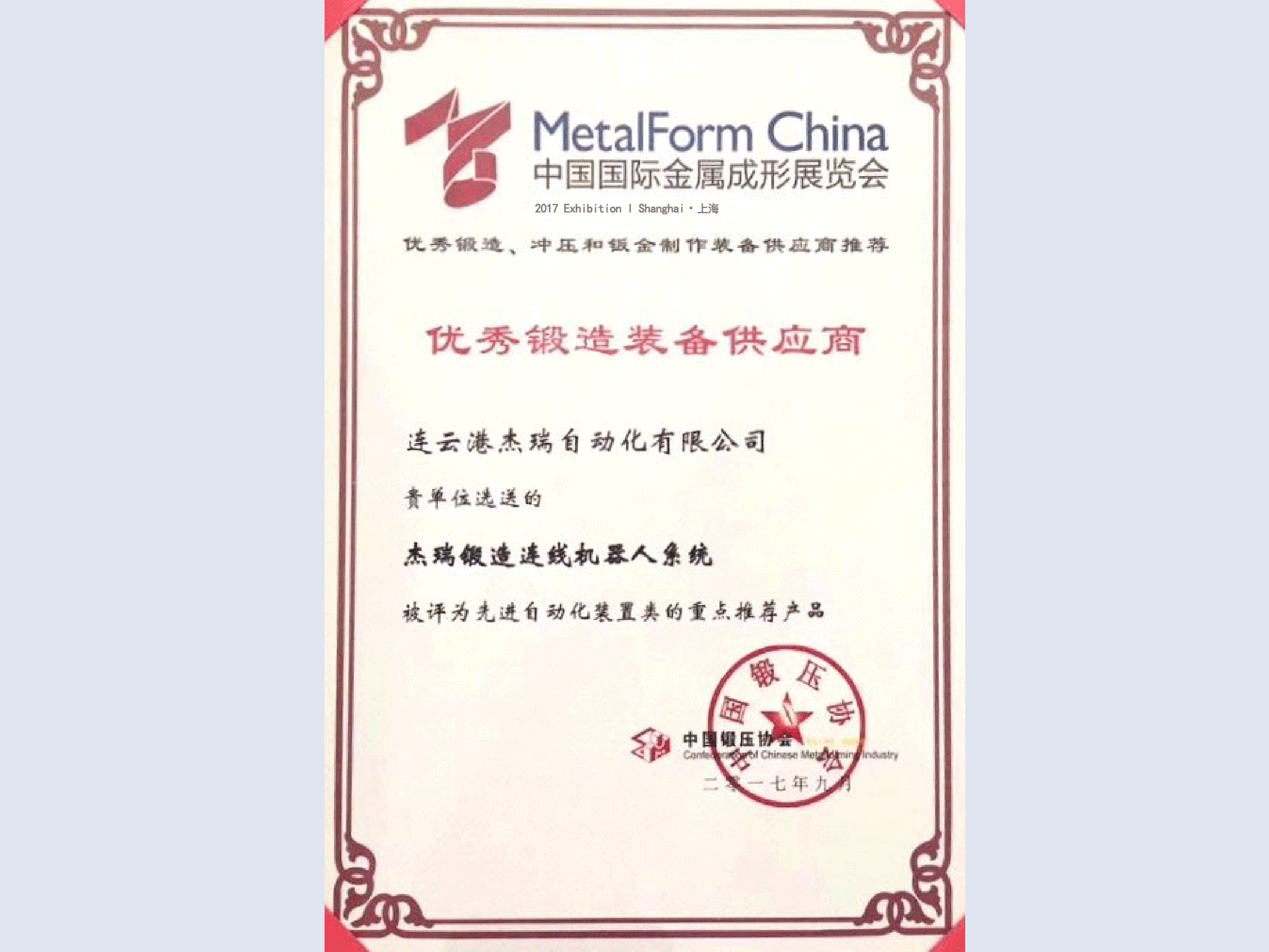 9.19-9.22日,2017中國國際金屬成形展覽會在上海舉辦,杰瑞自動化公司攜智能鍛造明星產(chǎn)品汽車萬向節(jié)溫鍛生產(chǎn)線參展,并在“2017中國鍛造企業(yè)智能化發(fā)展論壇”做專題報告,公司再次被授予“優(yōu)秀鍛造裝備供應(yīng)商”稱號,公司“杰瑞鍛造連線機器人系統(tǒng)”被評為先進自動化裝置類的重點推薦產(chǎn)品,展現(xiàn)出杰瑞自動化在智能鍛造領(lǐng)域不菲的影響力和專業(yè)化地位。